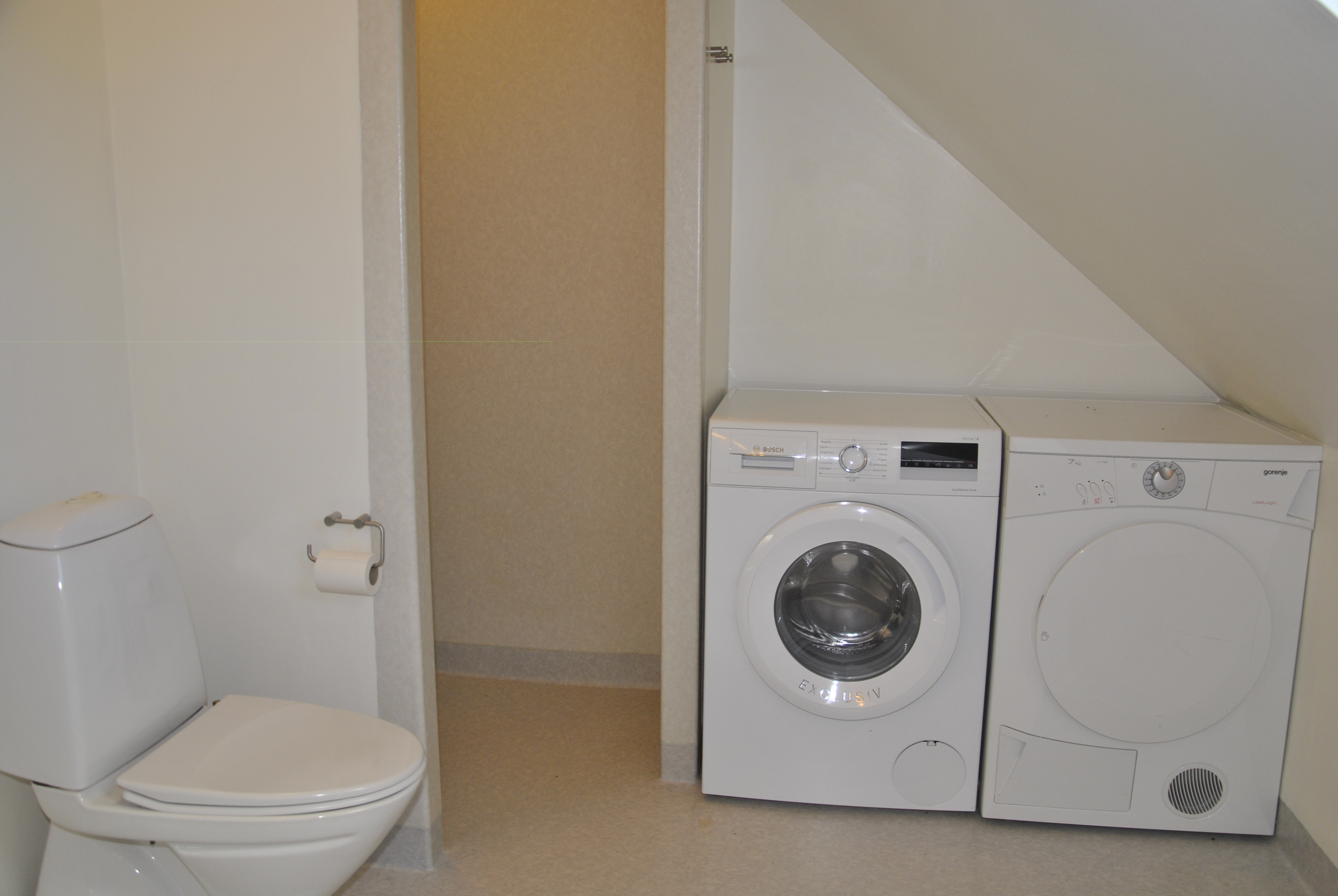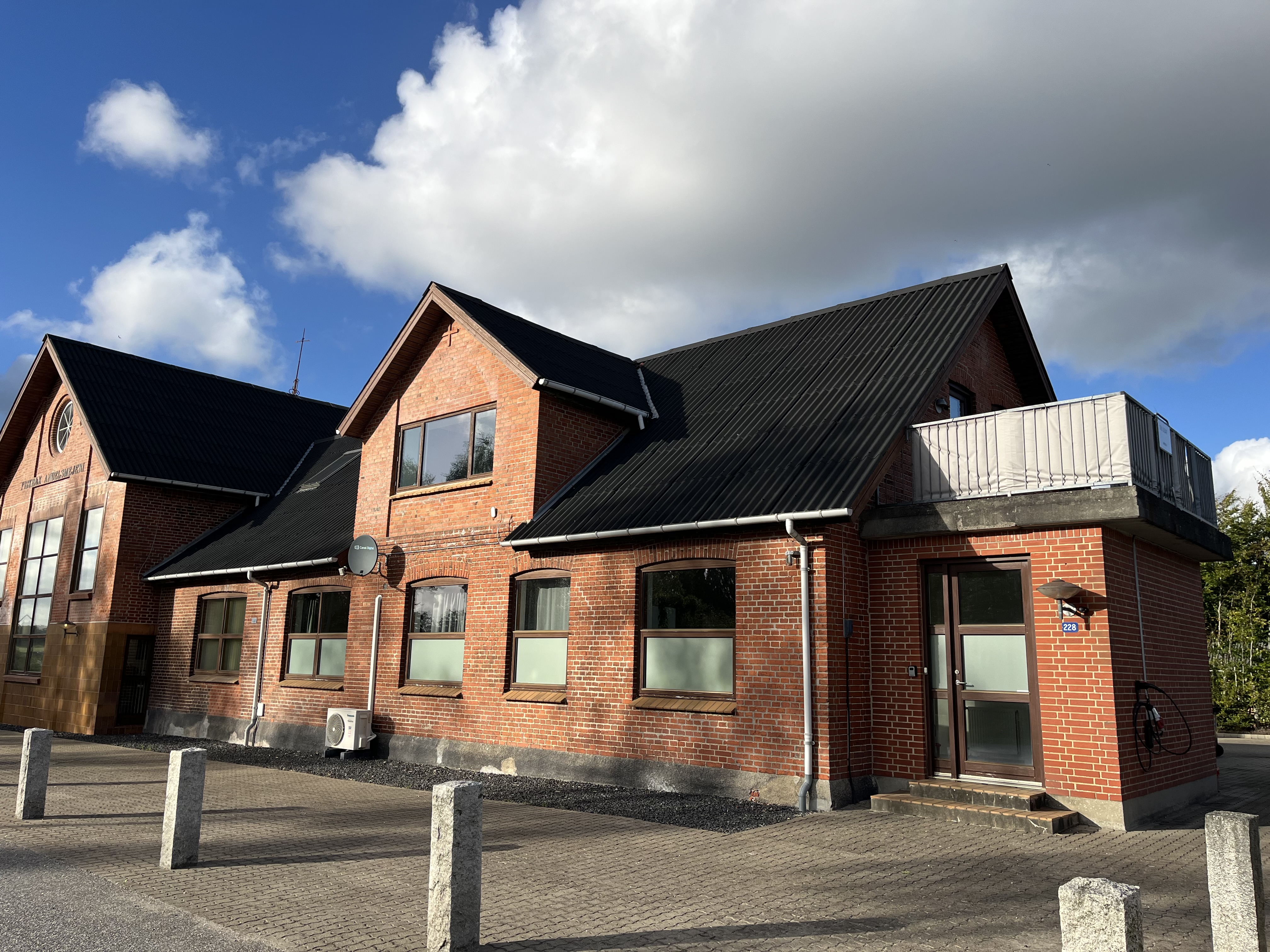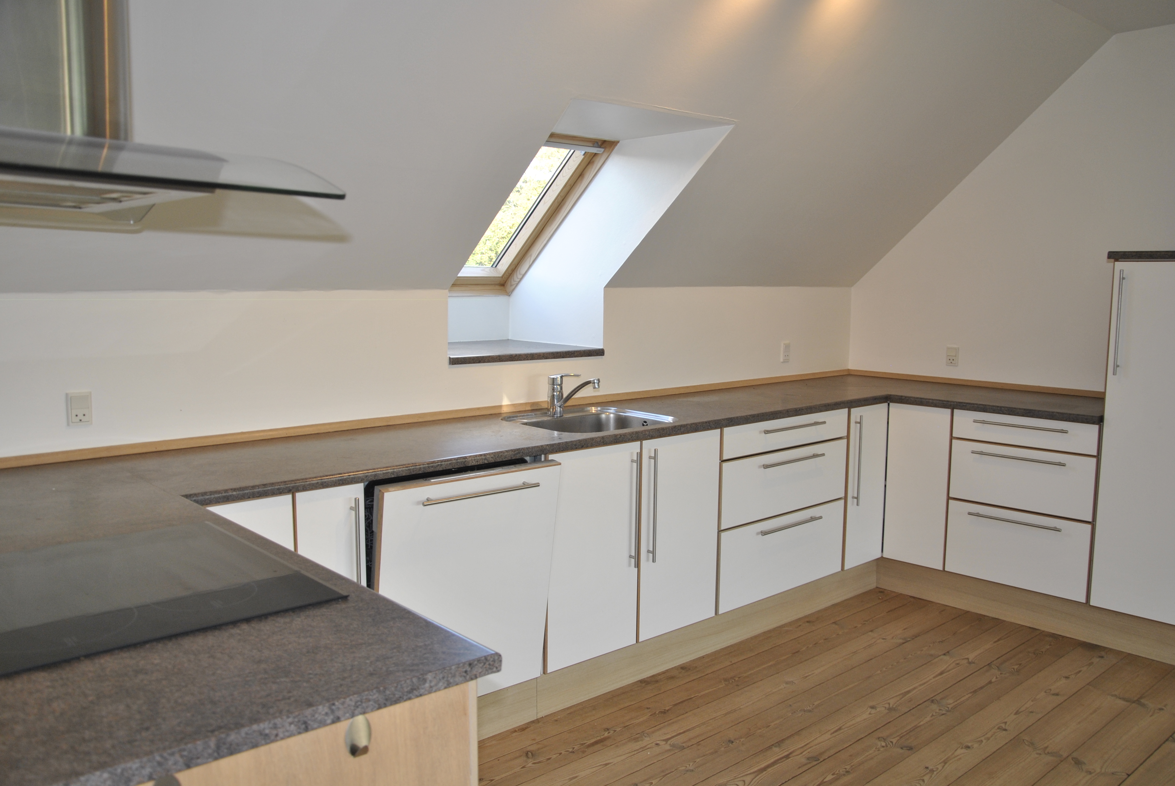 Entre, depotrum, soveværelse med faste skabe, stort køkken allrum med spiseplads, køleskab, ovn, kogeplader, emhætte og opvaskemaskine mellem gang med 3 trappe trin til stue / stort værelse med franske døre. Badeværelse med bruser, vaskemaskine og tørretumbler. Lejligheden er beliggende på 1 sal i Fiskbæk Gl. Mejeri, hvor der er 2 min kørsel til Løgstrup, 10 - 15 min til Viborg samt 20 min til Skive.